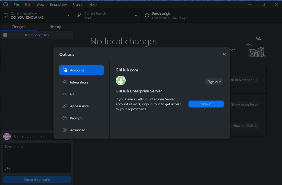 Open the GitHub Desktop and navigate to the Options as shown below or use shortcut Ctrl+Shift+A